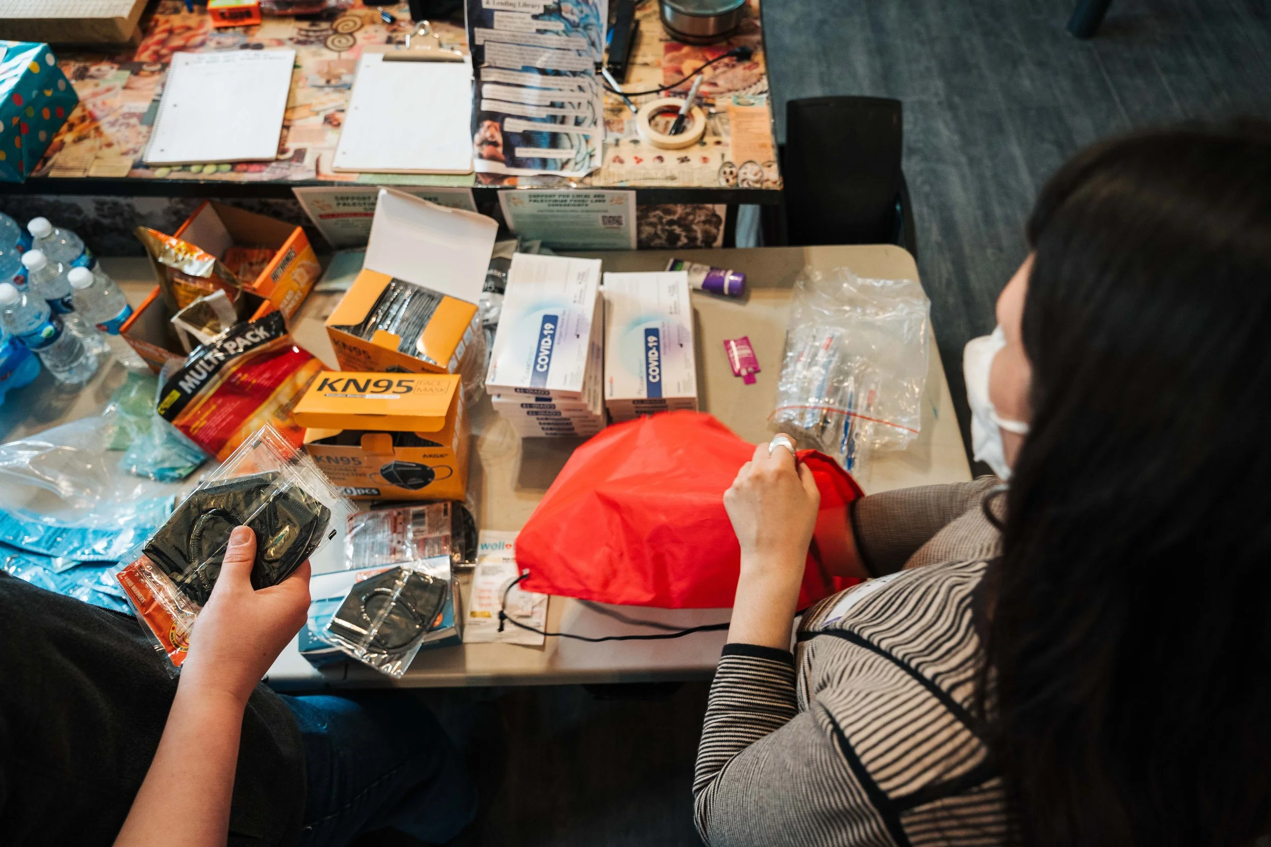 In an effort to integrate reentry support into our work, the Decarcerate Western Mass Bailout Project keeps a supply of reentry kits on-hand for the people we bail out of jail. These kits—which include personal hygiene products, snacks, writing materials, warming items, PPE, cash, and harm reduction supplies, and a list of local resources—meet some of the immediate needs of the people we bail out, who typically leave jail with whatever they came in with.